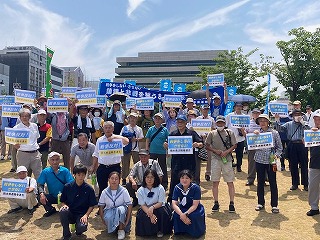 8月15日、熊本県退職者連合主催で熊本市中央区の辛島公園で100名が参加し「鎮魂と非戦を誓う8・15熊本平和集会」を開催しました。正午、熊本市役所のサイレンに合わせ、「戦争反対」、「防衛増税反対」のプラカードを掲げ黙祷を行いました。